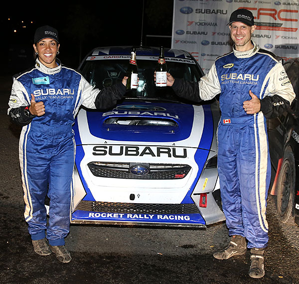 Nathalie Richard (left), Subaru Rally Team Canada (SRTC) co-driver, and Martin Rowe (right), SRTC driver, celebrate a second-place finish at Pacific Forest Rally. Photo courtesy of Phil Ericksen/Radikal Videos.