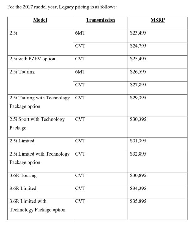 For the 2017 model year, all Legacy 2.5i models have a larger battery with more cold cranking amps, making it easier to start the vehicle on days with low temperatures.