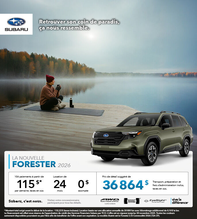 Le respect de votre vie privée est fondamental pour nous. Pour savoir comment Subaru Canada, Inc. protège les renseignements personnels que vous lui communiquez, veuillez consulter notre Politique de protection des renseignements personnels.