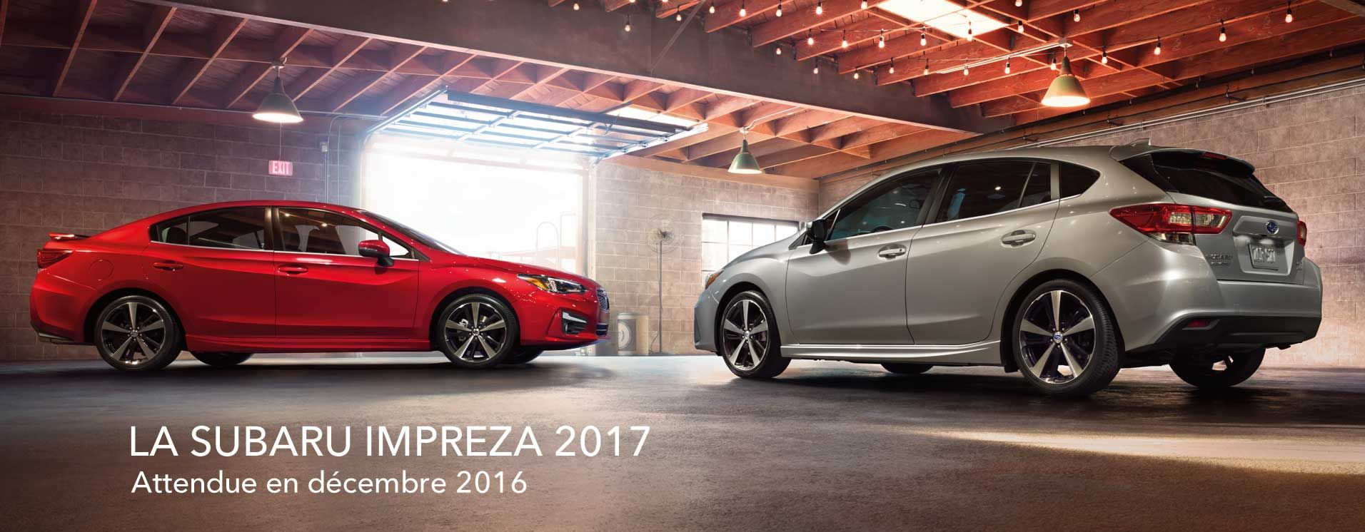 Voici celle que vous attendiez, peut-être même sans le savoir. Voici la Subaru Impreza 2017. Et voici ce que l’avenir réserve à l’univers des voitures compactes. Un moteur BOXER SUBARU plus puissant et plus écoénergétique. Une silhouette extérieure plus sportive. Un habitacle plus raffiné, offrant plus d’espace pour les occupants et leurs bagages. Plus de technologie. Une maniabilité supérieure. Une conduite plus fluide. Des normes de sécurité supérieures. Une meilleure valeur. Une expérience de conduite plus engageante. Il y aura bientôt deux moyens — soit une version quatre portes et une cinq portes — pour découvrir de nouveaux horizons et tenter de nouvelles aventures. Et dès lors que la